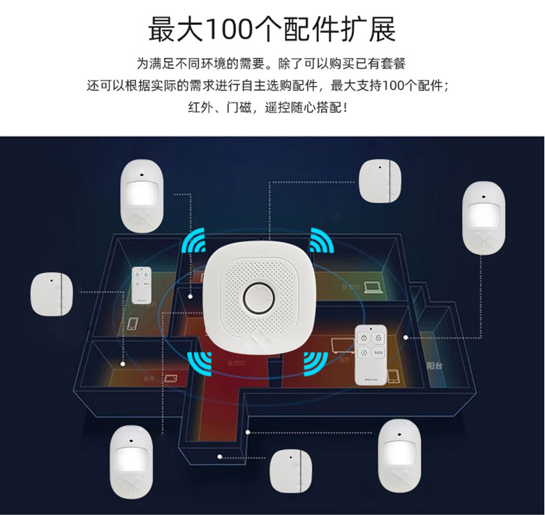 支持扩展至10个防区、每个防区10个无线探测器;